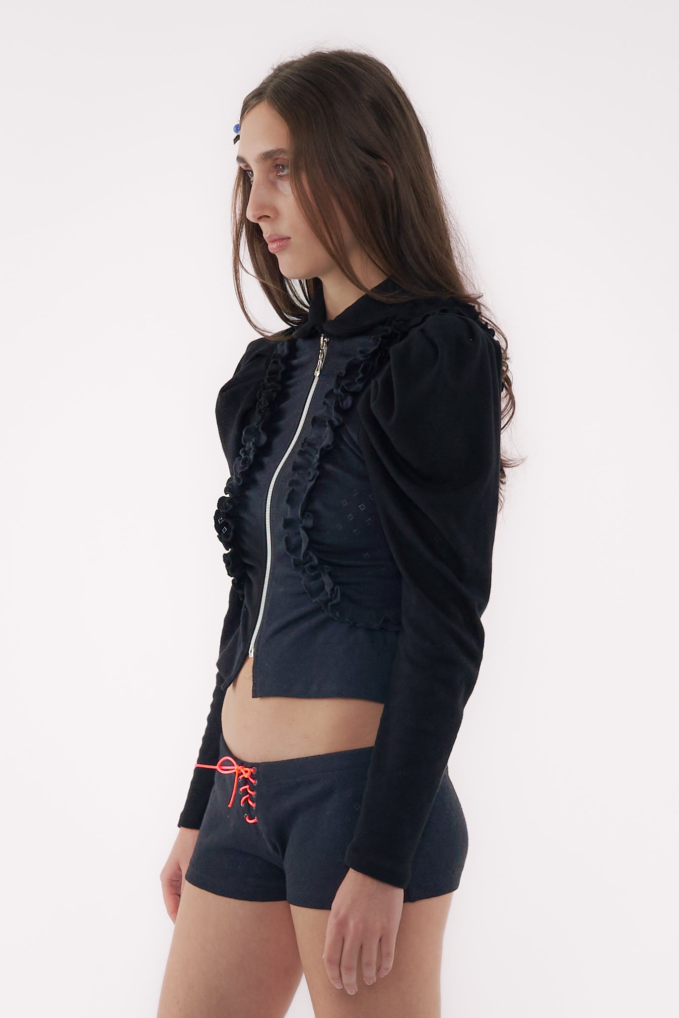 - Puff sleeves, ruffle trims on the front and back