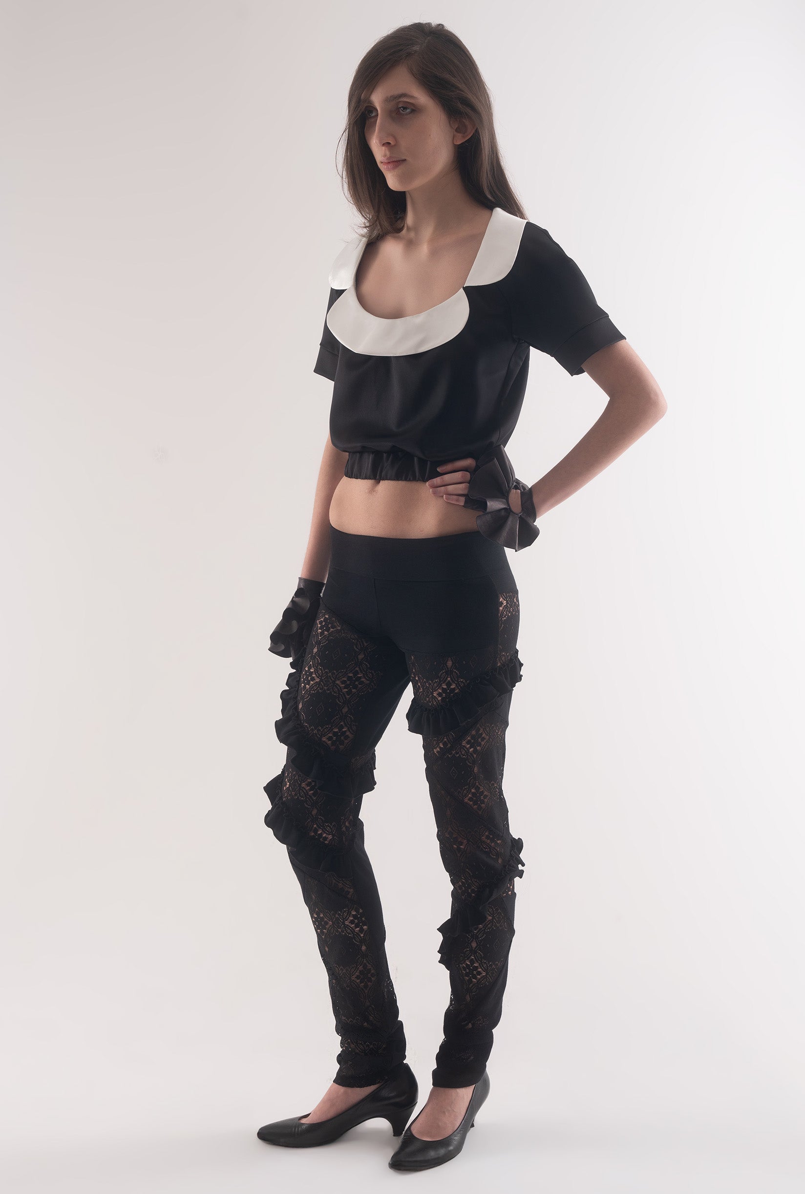 Short-sleeved, black satin cropped top, with a white rounded collar.