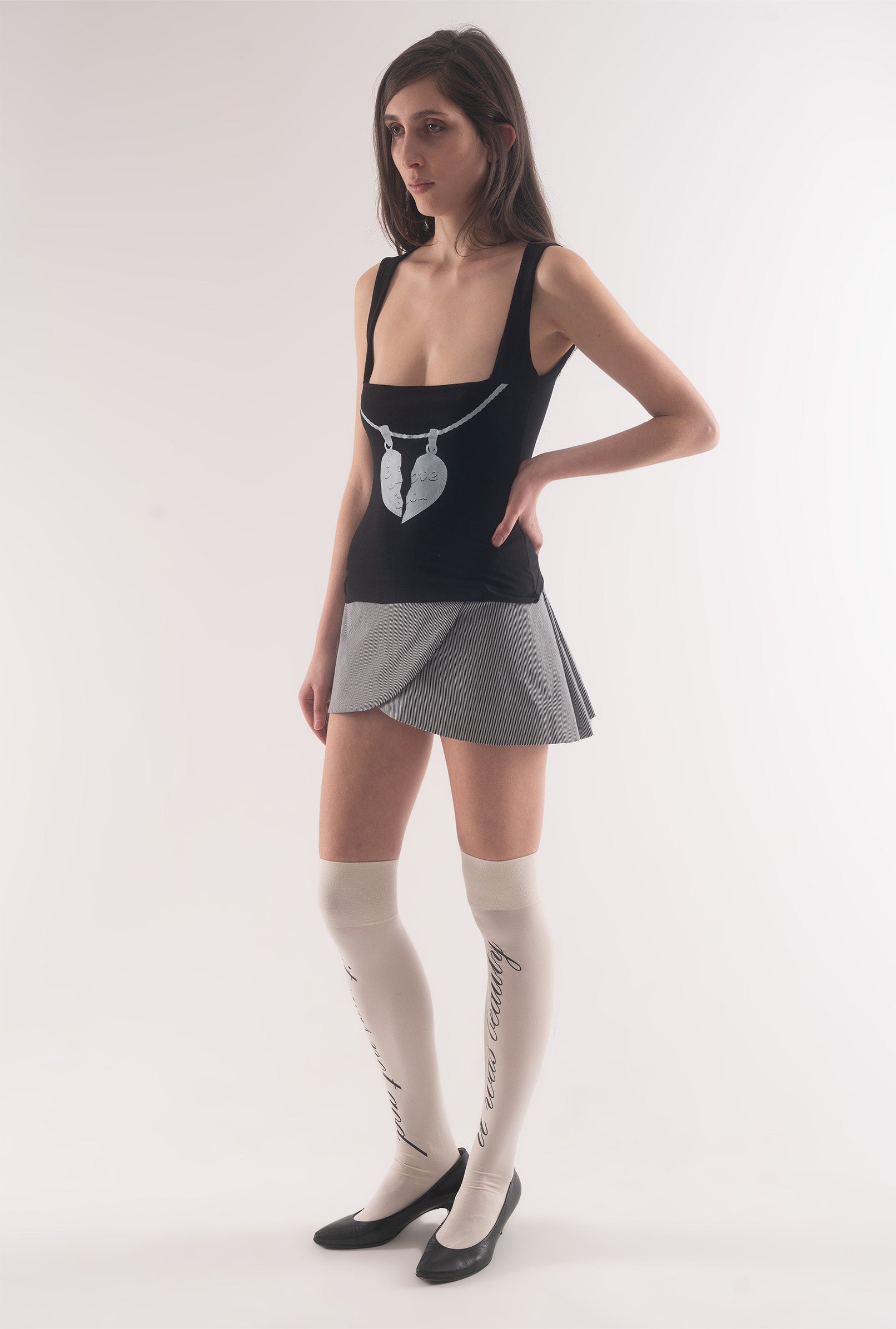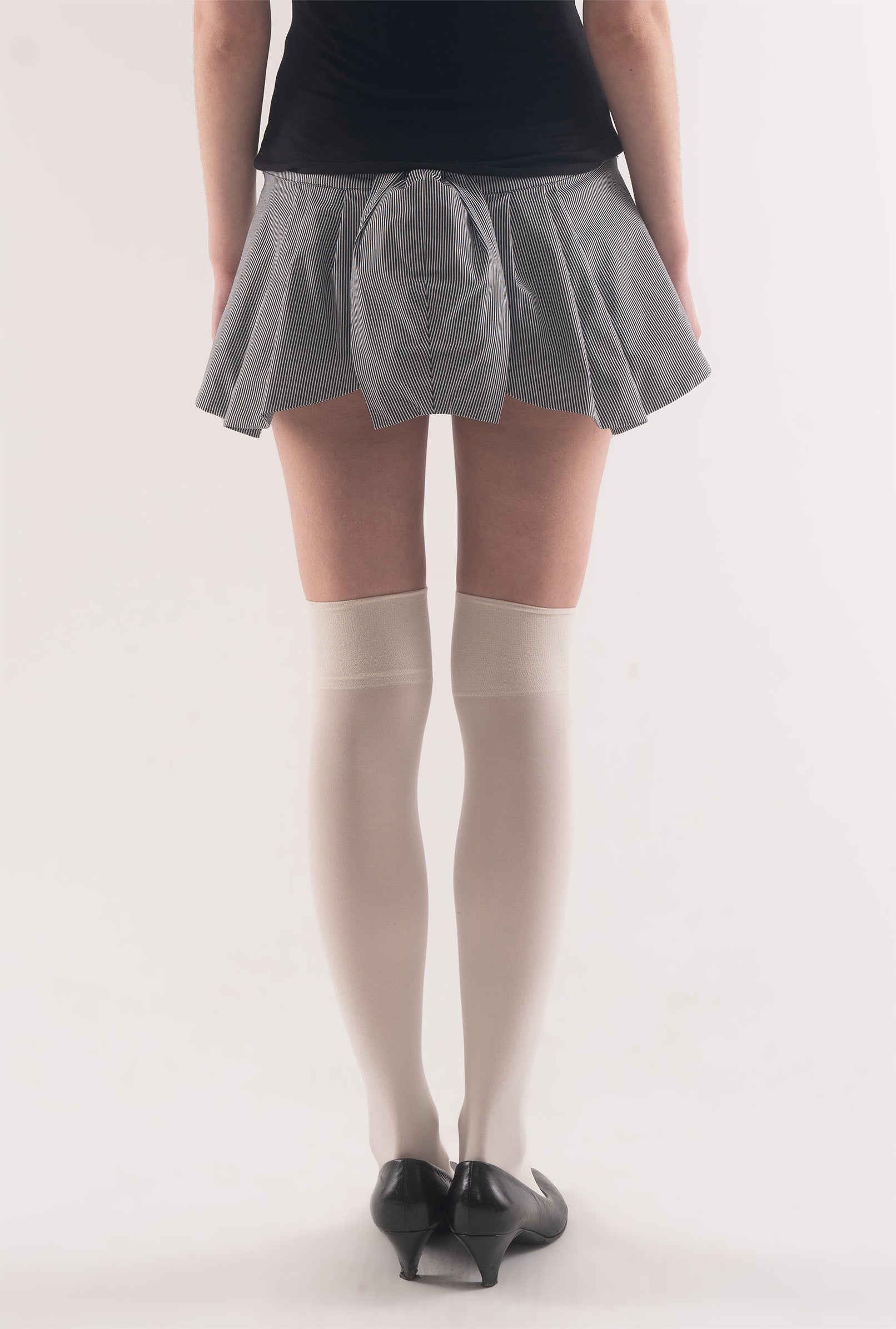 Mini skirt with built-in shorts, wrap front, and gathered back for a puffed effect.