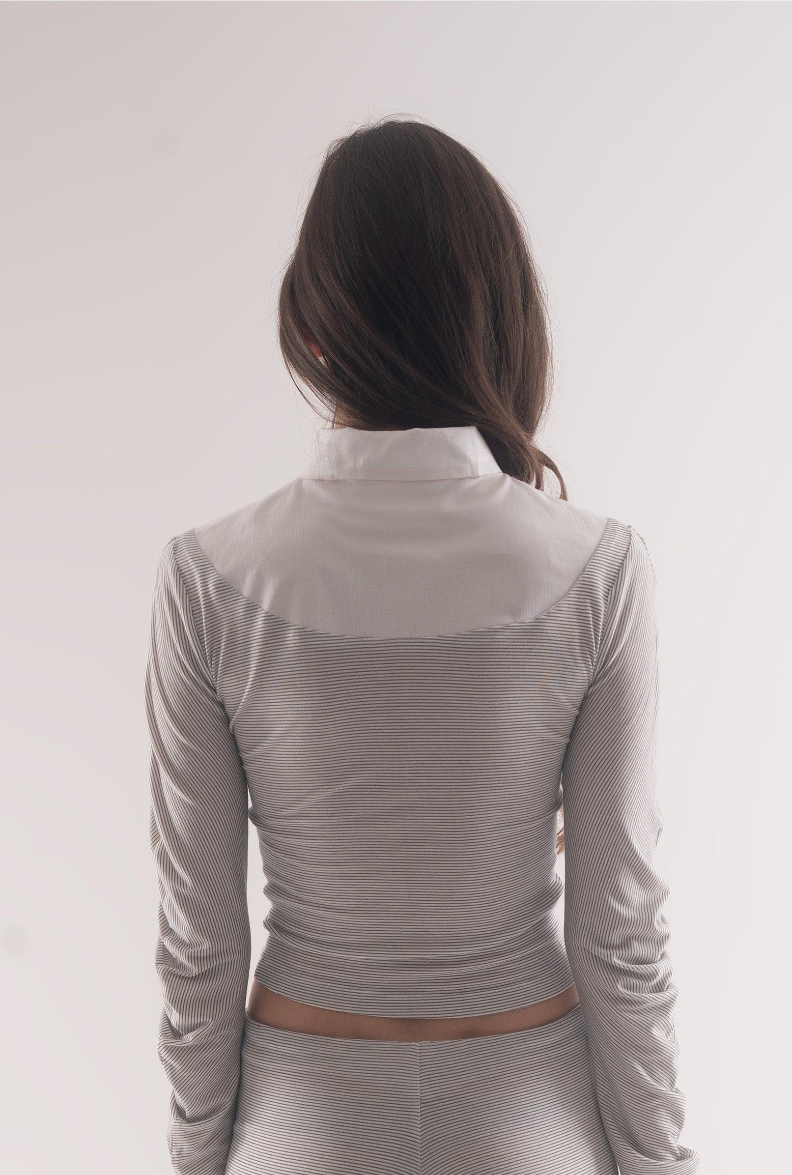 Long-sleeve, slim-fit polo top with a button down collar and lightly ruched sleeves.