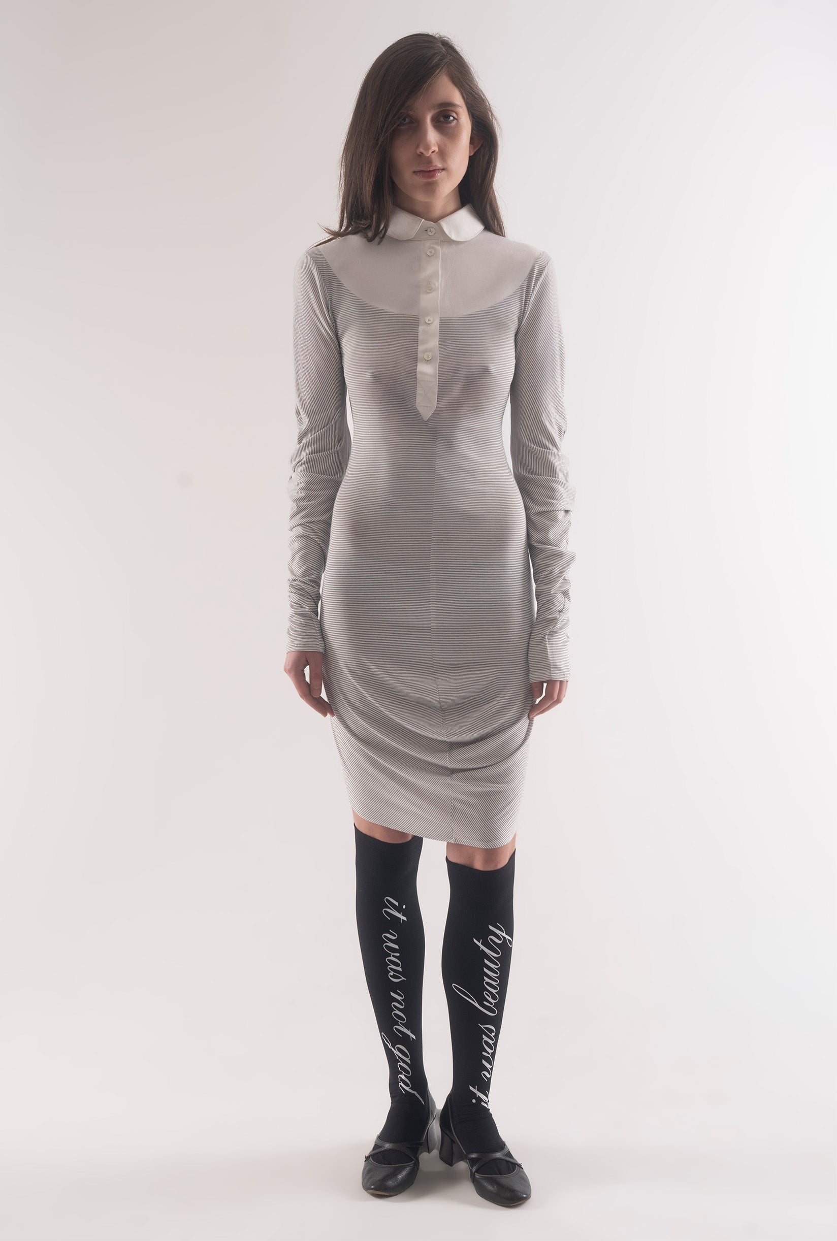 Viscose, long-sleeved grey and white stripe dress with white collar.