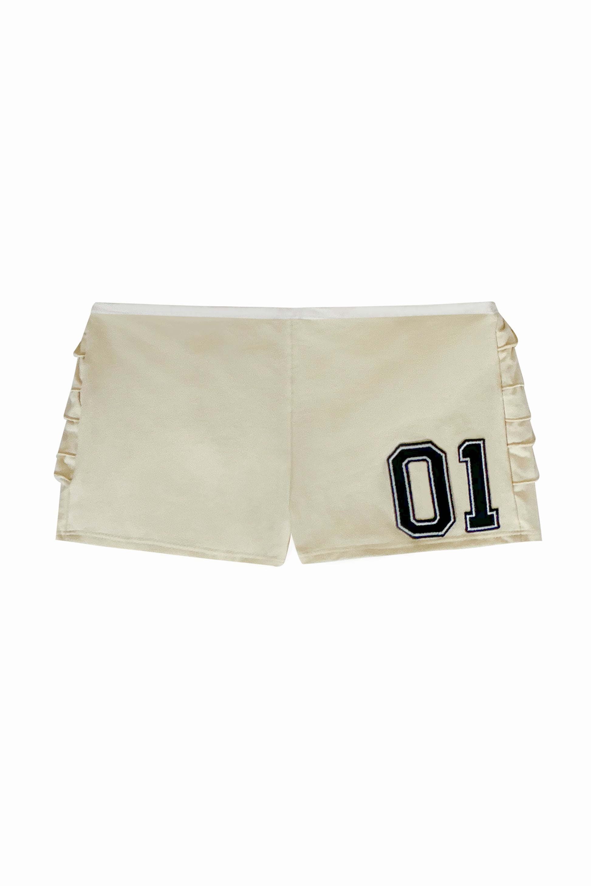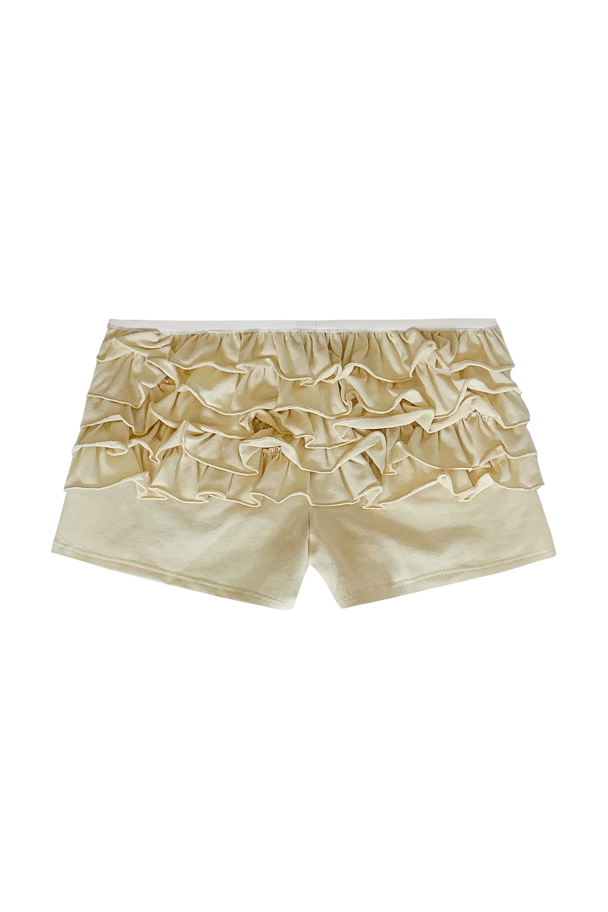 Low waisted mini-shorts with frill detail on back in ivory cotton jersey
