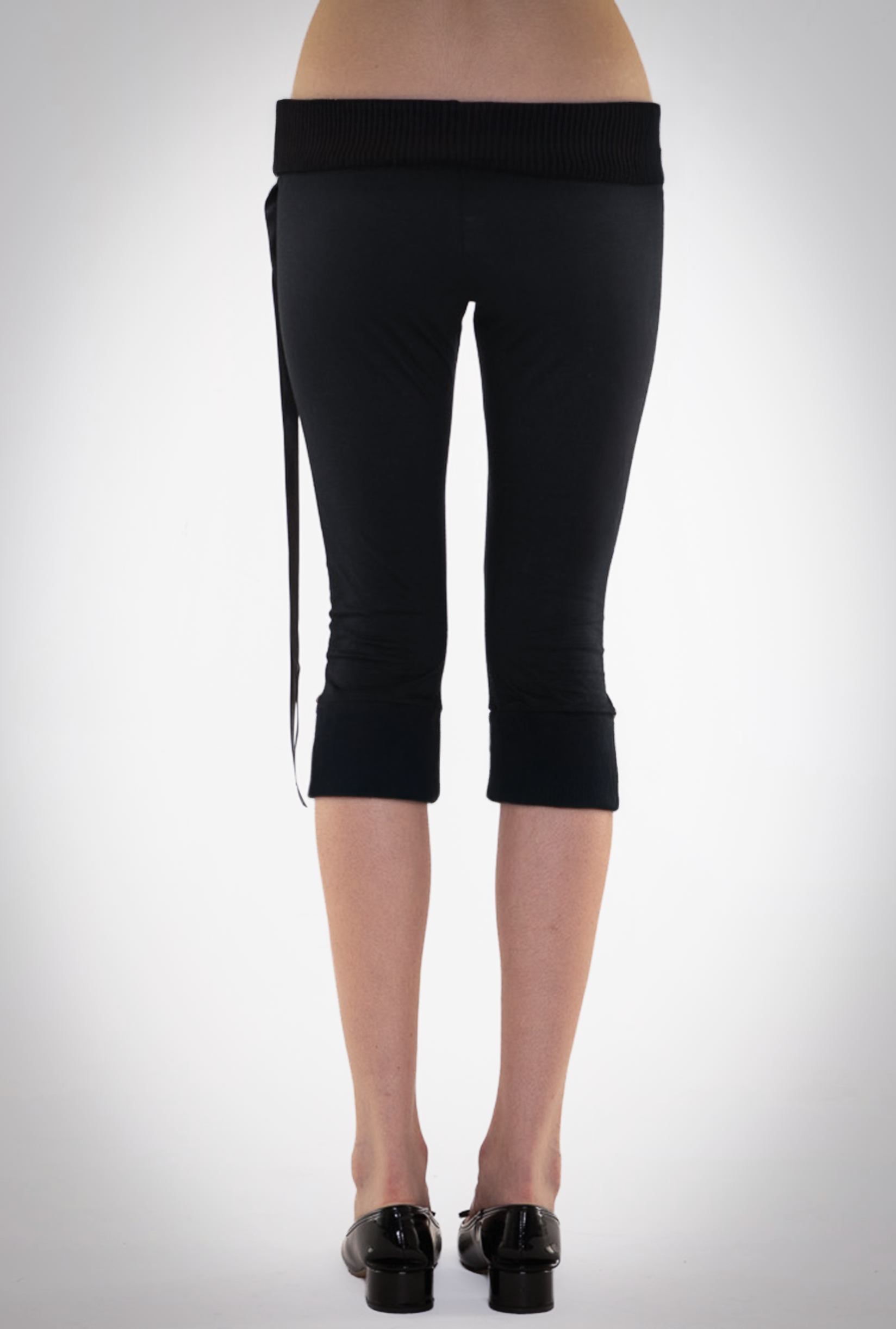 Cropped piece in black viscose, with a ribbed waistband and cuffed bottoms.