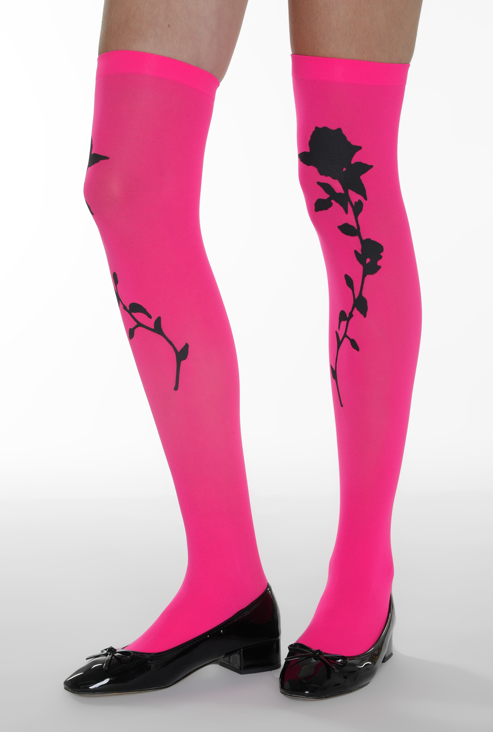 Over the knee pink stockings with floral black print